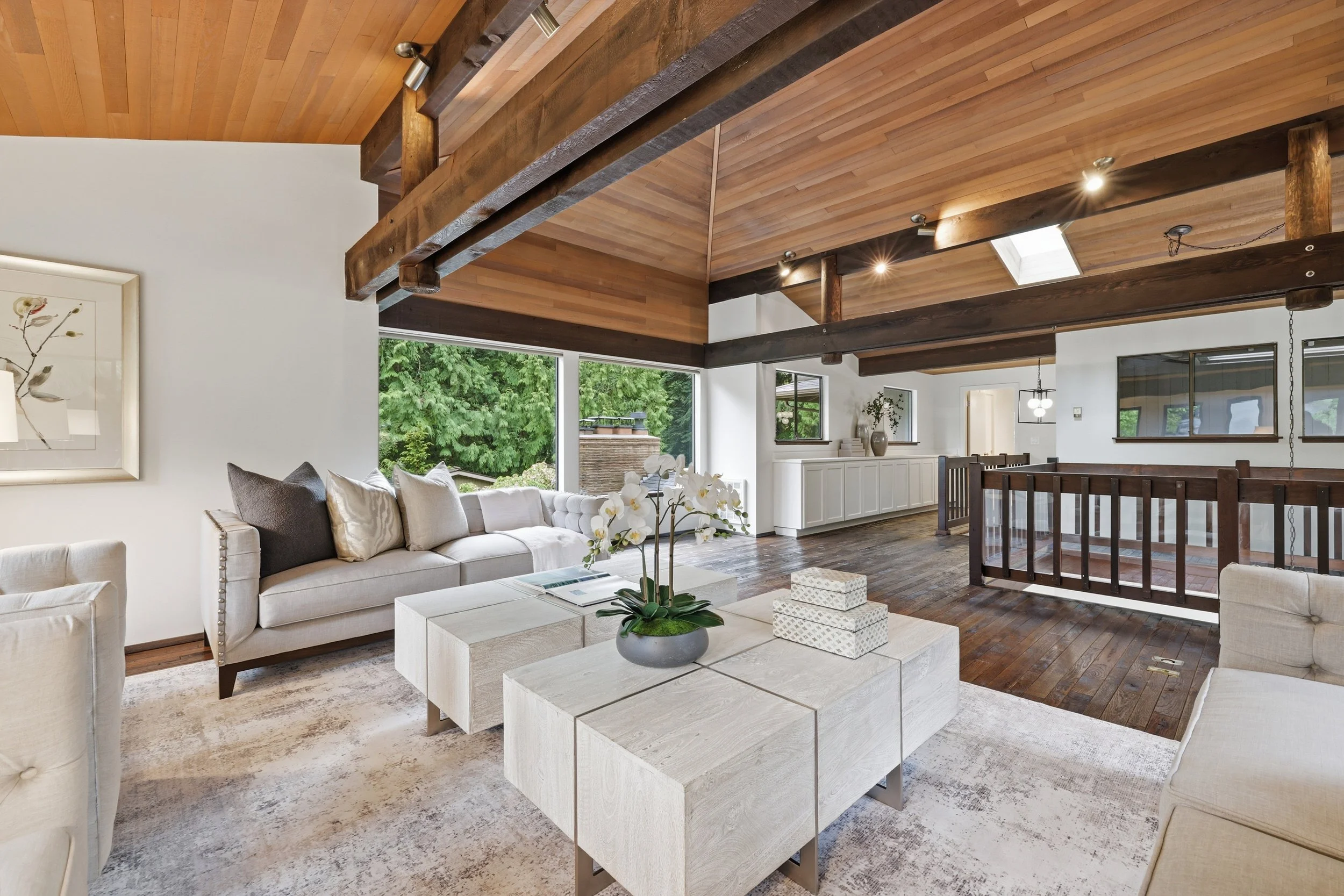 Upstairs, a very spacious and open family room or loft area showcases a vaulted cedar ceiling with timbered wood beams, a wall of windows on three sides, oak floors, and built-ins.